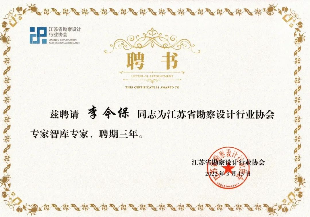 近日,经过江苏省勘察设计行业协会在全省范围内的层层筛选,我公司李今保董事长入选专家智库,聘期三年。